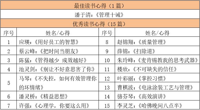 本次為2019年第三季度讀書心得評選活動,經總裁辦校對、審核,從100多篇心得中初選出30篇,再根據主題明確、立意新穎、結合工作實際、文字通順完整等篩選出16篇優秀心得,其中獲得本季度“最佳讀書心得”得主品質部潘于清的《管理十誡》評選。最佳及優秀文稿如下: